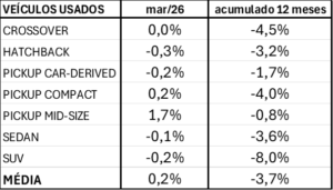 Em março, os veículos 0 km apresentaram alta média de 0,86% nos preços de transação. O avanço foi observado na maioria dos segmentos, com destaque para picapes médias, SUVs, hatchbacks e sedans, além de crossovers e picapes derivadas de automóveis. As picapes compactas se destacaram como exceção, registrando queda mais acentuada no período. O movimento indica recomposição de preços, em um ambiente de menor intensidade promocional e demanda mais equilibrada em alguns segmentos.
