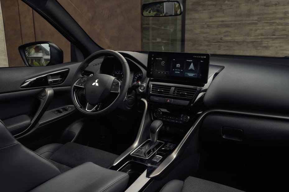 Por dentro, o Eclipse Cross Tarmac aposta em acabamento premium e conforto de alto nível. O SUV conta com bancos revestidos em couro e camurça com costuras cinza, ajustes elétricos e aquecimento nos assentos dianteiros, além de bancos traseiros reclináveis. O forro escurecido do teto e das colunas amplia a sensação de esportividade.